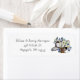 Mailbox art skinny address label with three lines of printed black text. An open mailbox with letters inside and a creeping vine with blue flowers is the artwork hand-drawn in pen and pencil.