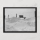 Black and white photo of a black mailbox on a fence with several feet of snow around it.