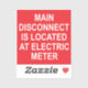 A red sticker with the words "MAIN DISCONNECT LOCATED AT ELECTRIC METER" in white letters. Good for electricians to satisfy labeling requirements.