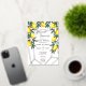 Boho-chic yellow lemons with varying shades of greenery adorning a gemstone geometric frame in gold foil with gold foil "Main Squeeze" script text. Elegant and classy for your bridal shower occasion. Back features an Italian tile look blue and white background. Composite design by Holiday Hearts Designs.