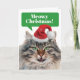 Beautiful Maine Coon cat with a Santa hat who is saying, "Meowy Christmas and a Happy Mew Year!" Cute and punny for cat lovers, but you have the option of changing the copy if it's too cute and punny for your taste.