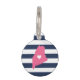 Let your furry friend show some home state pride with this cute Maine ID tag. Design features a white silhouette map of the state of Maine in pink with a white heart inside, on a preppy navy blue and white stripe background. Add your pet's name and contact information to the back in white lettering on a pink background.