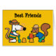 Maisy and Cyril are building a sand castle together at the beach, as seen in the book "Maisy Goes on Vacation" (published by Candlewick Press). Maisy is in her colourful striped bathing suit and sun hat, while Cyril is wearing his blue shirt and green pants.