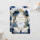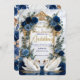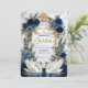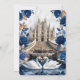Set the tone for a grand fairytale union with this majestic cathedral design. Features elegant swans, royal blue florals, and ornate baroque detailing.This design features a digital illustration of a grand cathedral interior reminiscent of the Duomo di Milano, featuring a sweeping staircase and a white marble floor. At the center, two white swans curve their necks to form a heart shape within a tiered fountain, accented by a printed gold glitter water effect. The scene is framed by an ornate baroque archway draped in navy and dusty blue roses with faux gold metallic leaves. The typography combines elegant gold calligraphy with classic serif fonts against a cream and white background.This is a flat printed image with a faux foil and glitter effect, not actual raised material or real metallic foil.