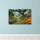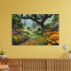 An ancient tree with sprawling branches heavy in magenta-pink blossoms arches overhead, framing a winding stone path through a vibrant paradise garden. Symmetrical beds burst with intense orange, yellow, purple, hot pink, and white flowers, bordered by lush palms, ferns, and tropical greenery, while distant mountains rise under a brilliant blue sky. Sunlight filters through leaves, casting dappled light and creating an atmosphere of abundant joy, timeless serenity, natural harmony, and pure delight—perfect for living rooms, sunrooms, bedrooms, home offices, meditation spaces, bathrooms, or as uplifting gifts for gardeners, nature lovers, wellness seekers, or anyone who finds peace and happiness in flourishing, colorful landscapes.