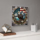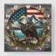 A striking eagle perches near a backdrop of mountains, a river, and the American flag, embodying the spirit of freedom and nature.