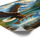 This vivid image captures the moment a majestic bald eagle swoops down effortlessly to snatch a lake trout from the tranquil waters of a mountain lake. The sunrise casts a soft glow on the snow-capped peaks, Pristine environment as the surrounding pines stand tall and undisturbed.