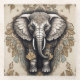 Majestic Elephant Mandala. illustration of an elephant at the centre, intricately designed with patterns resembling mandalas and floral motifs. The elephant's head is adorned with elaborate designs, blending seamlessly into its natural features. Surrounding the elephant are delicate, symmetrical floral patterns, with leaves and flowers in muted shades of beige, brown, and soft blue. The entire image has a harmonious and balanced composition, creating a sense of elegance and tranquillity.