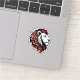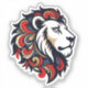 A majestic lion head illustrated in a vibrant, ornamental style. This side-profile design features intricate paisley swirls and floral filigree patterns in bold red, navy blue, and gold tones. The artistic mane flows with decorative curves, creating a regal and elegant look perfect for stickers, decals, and apparel.