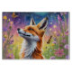 A majestic fox sits in a field of vibrant flowers, gazing up at the sky. Its beautiful red fur shines with white accents, and its pointy ears are alert. Butterflies flutter among the blossoms, surrounded by pink and purple hues. The fox rests gracefully in the long grass, encircled by the colorful flowers.