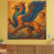 A stunning oil painting depicting the legendary griffin, a powerful mythological creature from Greek mythology combining the regal features of an eagle and the strength of a lion. This vibrant artwork showcases the griffin in rich, bold colours with masterful brushwork characteristic of traditional oil painting techniques. The creature is rendered with intricate detail, featuring magnificent feathered wings, sharp talons, and an fierce yet noble expression that captures the essence of this ancient guardian beast from classical mythology.