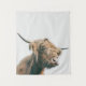 Portrait photograph of a majestic orange brown highland cattle on a foggy day with white background.