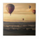 Majestic scene of hot air balloons floating in a sunset sky over a misty landscape.