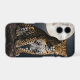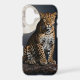 A powerful leopard with piercing yellow eyes and a sleek, spotted coat sits majestically on a stark, solitary branch. One paw dangles artfully across the center of the illustration, hinting at movement. Behind him, a vast, luminous harvest moon hangs in the inky night sky, casting an ethereal glow. Awesome phone case for anyone who loves leopards.