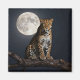 A powerful leopard with piercing yellow eyes and a sleek, spotted coat sits majestically on a stark, solitary branch. One paw dangles artfully across the center of the illustration, hinting at movement. Behind him, a vast, luminous harvest moon hangs in the inky night sky, casting an ethereal glow. Awesome magnet for anyone who loves leopards.