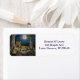 A leopard themed personalized return address labels. On the front is an illustration of a majestic leopard with fur like molten gold, laying on a cliff ledge bathed in ethereal moonlight. Intricate carvings adorn crumbling stone pillars, and bioluminescent flora casts a soft, otherworldly glow. The scene is rendered in a rich, textural oil painting style with thick strokes.