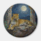 Leopard themed magnet. On the front is an illustration of a majestic leopard with fur like molten gold, laying on a cliff ledge bathed in ethereal moonlight. Intricate carvings adorn crumbling stone pillars, and bioluminescent flora casts a soft, otherworldly glow. The scene is rendered in a rich, textural oil painting style with thick strokes.