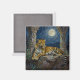 Leopard themed magnet. On the front is an illustration of a majestic leopard with fur like molten gold, laying on a cliff ledge bathed in ethereal moonlight. Intricate carvings adorn crumbling stone pillars, and bioluminescent flora casts a soft, otherworldly glow. The scene is rendered in a rich, textural oil painting style with thick strokes.