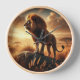 A majestic lion stands proudly on a rock in the middle of the African savannah. The scene is dipped in warm, golden light of sunrise or sunset, highlighting the lion's impressive mane. In the background the wide nature stretches with high grasses, isolated acacia trees and gentle, far-reaching hills. The sky shows light clouds that give the scenery an additional depth and atmosphere. The presentation is realistic and detailed, focusing on the textures of the fur and the surrounding area.