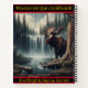 A grand moose stands near a serene waterfall, surrounded by tall evergreen trees. The sun sets behind the mountains, casting a warm glow on the tranquil landscape.