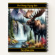 A magnificent moose stands proudly beside a cascading waterfall, surrounded by vibrant trees and colourful foliage. The backdrop features majestic mountains that enhance the peaceful atmosphere.