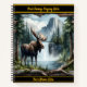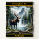 A magnificent moose stands gracefully near a serene waterfall, surrounded by towering trees and rugged mountains under a soft morning light, embodying nature's tranquillity and beauty.