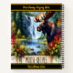 A striking moose stands proudly by a tranquil river, surrounded by vibrant fall foliage and a stunning waterfall cascading in the background, embodying the beauty of nature in autumn.