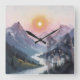 The scene is a watercolor illustration of a lovely sunset over some majestic mountains with a river flowing between the the mountains and there is a wolf that is almost hidden or slightly transparent illusion in the painting. The design is created to get a second look and find the wolf. This square clock makes for an unusual clock and will make for interesting wall art and decor.