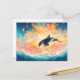 This stunning postcard features a majestic orca leaping gracefully above a deep blue sea. The killer whale's sleek silhouette is illuminated by a spectacular explosion of warm light, featuring vibrant orange, peach, and golden watercolor splashes that resemble a sun-drenched sky. Below, the churning waves are rendered in rich navy and indigo, with white sea foam catching the ethereal glow from above. The airy, painterly textures and high-contrast color palette create a powerful sense of freedom and natural wonder. This postcard is an ideal choice for sending an inspirational message of strength, a thoughtful "thinking of you" note, or for use as a vibrant piece of ocean-themed wall art.