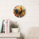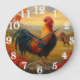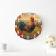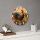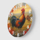 Vibrant farmhouse clock showcases a multicolored rooster (red/orange/blue/black feathers) standing proudly on rocks, with red maple leaves, a brown horse, and mountain farmhouse in the background. White numerals and black hands enhance readability—ideal for kitchen decor or countryside gifts.