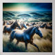 A vibrant painting capturing a herd of horses galloping through a lush field, their flowing manes and tails creating a sense of dynamic movement and freedom.