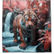 This stunning image captures a majestic tiger gracefully lounging by a serene stream and cascading waterfall. Surrounded by vibrant pink blossoms and lush trees, the scene evokes a sense of tranquillity and beauty. The unique infrared effect transforms the natural colours, highlighting the tiger's striking features and the enchanting landscape. The gentle flow of the water complements the elegance of the tiger, creating a captivating visual experience. This artwork is perfect for animal lovers and nature enthusiasts, adding a touch of wild beauty to any space.