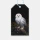 Animal portrait photograph of majestic snowy owl standing on a branch.