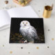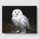 Animal portrait photograph of majestic snowy owl standing on a branch.