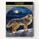 A solitary wolf stands atop a snowy hill, its fur glowing softly under the luminous full moon. The night sky is filled with stars, creating a serene and wild atmosphere