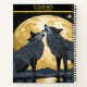 Under a vibrant, full moon, two wolves stand side by side, their heads lifted in a harmonious howl. The night sky is adorned with twinkling stars, and the reflections shimmer in the water, creating a serene and enchanting atmosphere.