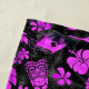 Black and Pink Colorway. A conversation print of tikis, palm trees, tropical fish, ukeleles, hibiscus and plumeria flowers are reminiscent of the designs used in vintage aloha shirts in the forties & fifties. The batik texture adds a unique texture throughout the design.This design comes in several colorways.