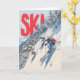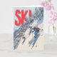 This dynamic skiing illustration captures the thrill of racing down a steep, snowy mountain toward a cozy alpine village below. Three skiers carve through fresh powder, surrounded by snow-covered trees and crisp blue sky. Bold red “SKI!” lettering adds energy and excitement, making it perfect for winter-sports lovers and adventure-themed gifts.