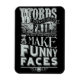 A rather Victorian, old-timey typographic design letting everyone know that words aren't always your preferred way to communicate. "Words sometimes fail me. When that happens, I make funny faces." Choose your favourite background colour! Design by Paxdomino