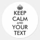 Make customised keep calm round stickers with this template. It has the keep calm crown logo in black and words in black letters. It says Keep Calm and Your Text.