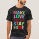 A colourful text Make Love Not War Stay Home against the black or dark colour background. Funny unique t-shirt for anyone. Do not forget to choose another style, size, colour, and gender of the apparel. You can transfer this design to another product. Have fun, buy one, enjoy, stay safe, and be happy! Show off your unmatched style when you go outside. Keep your chin up, stay safe, buy one, and be happy.