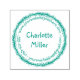 Personalised round pre inked rubber stamp with custom name and contact information. Easy to make - just edit the sample text to add your info. It's decorated with a simple wreath. Take a look at the selection of ink colours we offer so you can decide if you will keep the forest green or find one that suits you better.