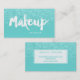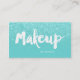 A modern, stylish makeup artist business card with modern hand lettering style brush typography in white on a teal faux glitter and turquoise teal trendy and elegant background.