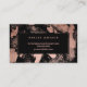 An elegant modern, stylish makeup artist business card with elegant script hand lettering style typography in white on a faux rose gold brushstrokes and paint and black elegant background. If you need any customisation, don't hesitate in contacting me