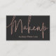 An elegant modern, stylish makeup artist business card with elegant modern simple hand lettering style typography in rose gold on a fgrey backgound. all text is customisable, add your social media.