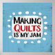 "Making Quilts Is My Jam" is a cute text design in blue with black and red text, along with a white accent shape and white textured whimsical dots surrounding it.