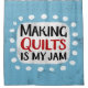 "Making Quilts Is My Jam" is a cute text design in blue with black and red text, along with a white accent shape and white textured whimsical dots surrounding it.