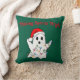 "Making Spirits Bight" green and red holiday pillow with ghost wearing a Santa hat and holding Christmas lights