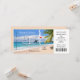 A fun but stylish wedding invitation in a boarding pass/ticket style for couples getting married abroad in The Maldives which is shown in a white map silhouette on a generic beach and palm trees scene, with sweet red love hearts, plane silhouette and swirling heart shape. The reverse of the boarding pass has space for lots more detail and a personal photo template.
