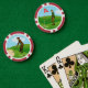 Awright, so there isn’t a saint in sight here. We just couldn’t help ourselves from issuing these humourous, stylised images of male golfers on their own on poker chip golf ball markers! Front: An optimistic, elderly male golfer makes a tap-in putt on the 18th hole. This dapper gentleman wears a yellow cap and tie, white shirt and green sport jacket, and tan knickers with yellow socks. Back: A young, panic-stricken duffer tries to blast his way out of a bunker or sand trap with a pitch shot onto the green. The height of Victorian male fashion, he is outfitted in a white shirt and brown plaid sports suit accessorised with a burgundy cap and matching socks. + Public Domain line drawings or clipart colourized by Saints_Aplenty.